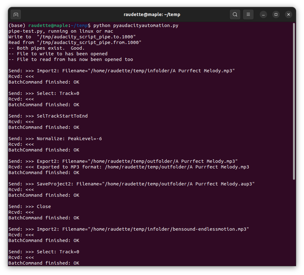 importosimportsys# Adapted from https://github.com/audacity/audacity/blob/master/scripts/piped-work/pipe_test.py# In Windows, remember to add escapes, like C:\\Users\\RichardAudette\\temp\\infolder\\ infolder="/home/raudette/temp/infolder"outfolder="/home/raudette/temp/outfolder"ifsys.platform=='win32':print("pipe-test.py, running on windows")TONAME='\\\\.\\pipe\\ToSrvPipe'FROMNAME='\\\\.\\pipe\\FromSrvPipe'EOL='\r\n\0'else:print("pipe-test.py, running on linux or mac")TONAME='/tmp/audacity_script_pipe.to.'+str(os.getuid())FROMNAME='/tmp/audacity_script_pipe.from.'+str(os.getuid())EOL='\n'print("Write to \""+TONAME+"\"")ifnotos.path.exists(TONAME):print(" ..does not exist. Ensure Audacity is running with mod-script-pipe.")sys.exit()print("Read from \""+FROMNAME+"\"")ifnotos.path.exists(FROMNAME):print(" ..does not exist. Ensure Audacity is running with mod-script-pipe.")sys.exit()print("-- Both pipes exist. Good.")TOFILE=open(TONAME,'w')print("-- File to write to has been opened")FROMFILE=open(FROMNAME,'rt')print("-- File to read from has now been opened too\r\n")defsend_command(command):"""Send a single command."""print("Send: >>> \n"+command)TOFILE.write(command+EOL)TOFILE.flush()defget_response():"""Return the command response."""result=''line=''whileTrue:result+=lineline=FROMFILE.readline()ifline=='\n'andlen(result)>0:breakreturnresultdefdo_command(command):"""Send one command, and return the response."""send_command(command)response=get_response()print("Rcvd: <<< \n"+response)returnresponse# Actual logic is hereforfilenameinos.listdir(infolder):infile=os.path.join(infolder,filename)outfile=os.path.join(outfolder,filename)# checking if it is an MP3 fileifos.path.isfile(infile)and"mp3"ininfile.lower():infile_cleanname=infile.replace("\\","/")# All audacity operations heredo_command(f"Import2: Filename=\"{infile_cleanname}\"")do_command("Select: Track=0")do_command("SelTrackStartToEnd")outfile_cleanname=outfile.replace("\\","/")#Start of sound manipulation operations# Any operation you want to perform on the samples, add them here#This line adjusts loudness - sets LUFS#do_command("LoudnessNormalization: LUFSLevel=-23")#This line sets peak sound level to -6 dBdo_command("Normalize: PeakLevel=-6")#End of sound operations - export filedo_command(f"Export2: Filename=\"{outfile_cleanname}\"")do_command(f"SaveProject2: Filename=\"{outfile_cleanname.replace('.mp3','.aup3')}\"")do_command("Close")