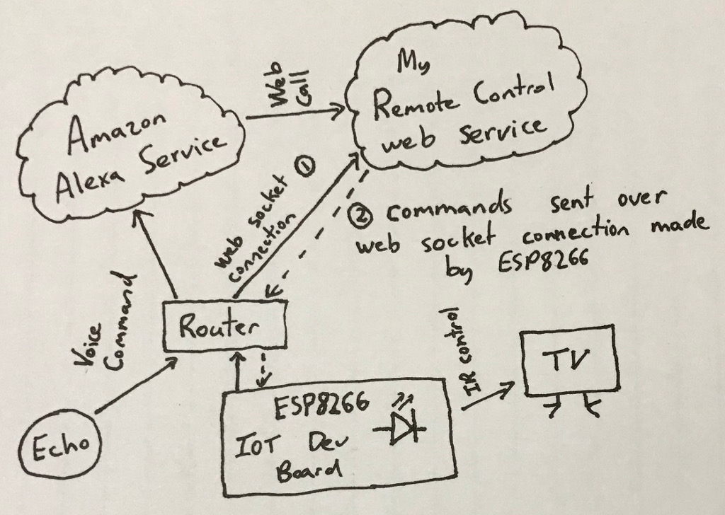 As I had mentioned in my last post, I’ve built Alexa skills before, and to do this, you need to build a web service that Amazon’s servers can reach - something on the public Internet that can handle HTTPS. I wanted this service that was handling Alexa calls to control this ESP8266 in my home. I don’t like opening up ports on my home firewall, so I had to figure out a way to control the ESP8266 on my home network like every IoT device you can buy off the shelf. I hadn’t done this before, but I knew it was possible.