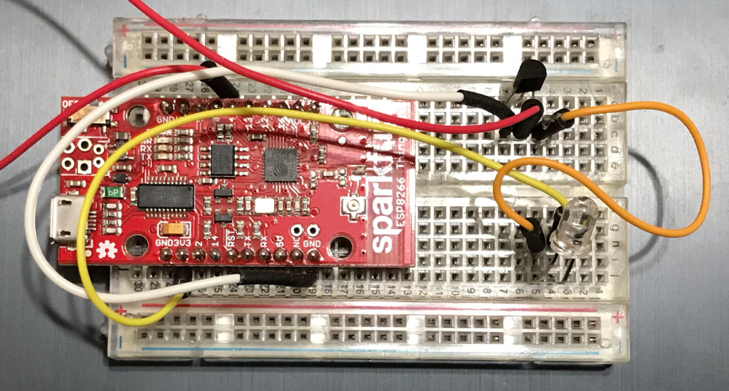 I have an old TV which was acquired used, without a remote. The power button has become a little finicky. Rather than going out and buying a new TV, or a universal remote, I thought it would be fun to build one. I had a Sparkfun ESP8266 dev board that wasn’t currently being used, and an Amazon Echo Dot in the same room as my TV, so I decided to make an Amazon Alexa-controlled remote rather than build a physical one with buttons.