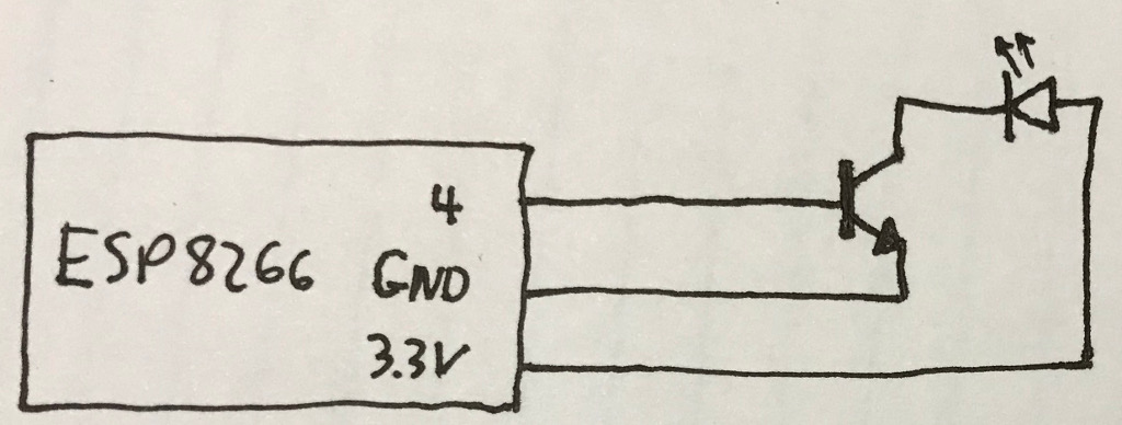 On the ESP8266, I used the ArduinoWebSockets library to build the web socket client. Getting the ESP8266 to send IR commands to the TV was super simple. I connected an infrared LED to pin 4 of the ESP8266. Some article I read suggested using a transistor to increase current supplied to the LED, so I did. I used the IRremoteESP8266 for IR, and found the IR codes for my TV on http://irdb.tk/.