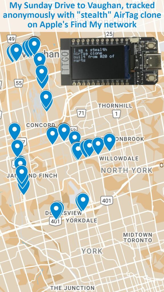 But, it seemed like if we sent our Tile’s MAC ID to someone else to load on to their ESP32, and track with their Tile app, it wouldn’t report the location. And, although Tile reports thousands of users in my area, even a genuine Tile didn’t seem to get picked up by other Tile users walking through office food courts, malls, or transit hubs. As a result, at the end of two weeks, many questions remained unanswered.