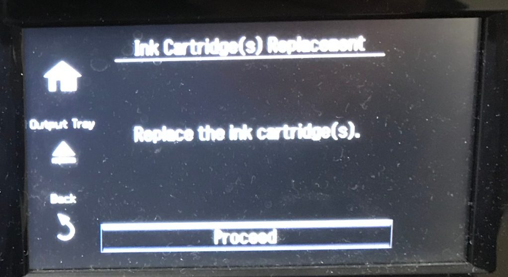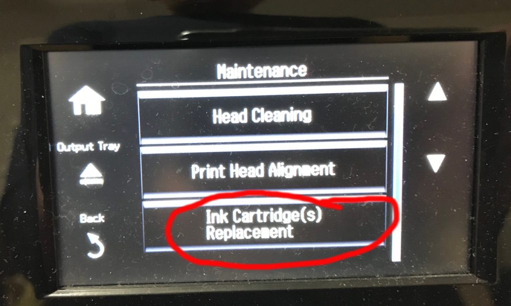 The first step was getting the print head out of its right-side dock. Go to the menu, click maintenance, and then click Ink Cartridge Replacement.