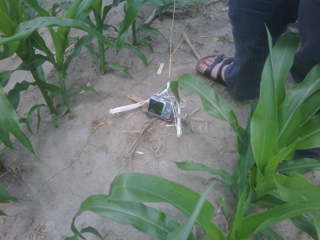 We tried again after lunch. I only had 300 ft of kite line, but Craig had a huge bag of hay bale twine - an essentially unlimited supply of rope. We programmed the camera to take photos every 20 seconds for 30 minutes. We took a photo from the ground early on, and an airplane passed by.