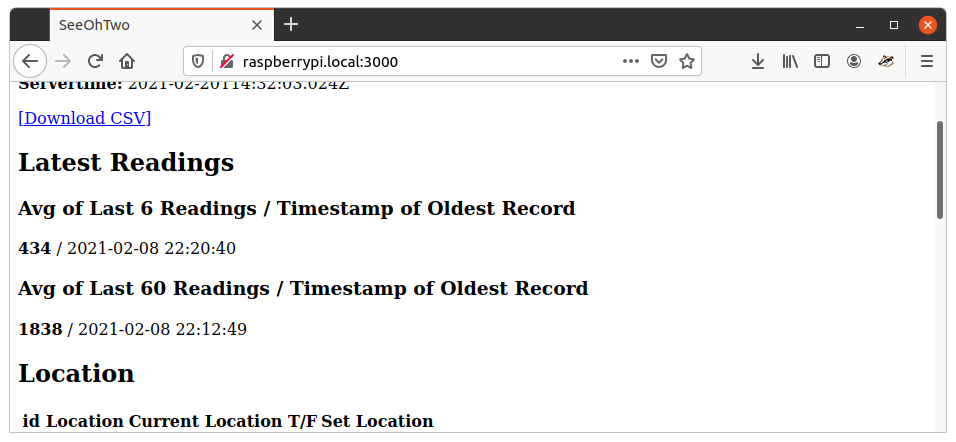 The code looks for a USB connected device based on the manufacturer’s string defined in seeohtwoconfig.json - for the SparkFun board I’m using, this is “FTDI” - you may have to update this setting for your board. The logger allows you to start/stop logging, associate a location with the data being logged, and to download a CSV file with the collected data.