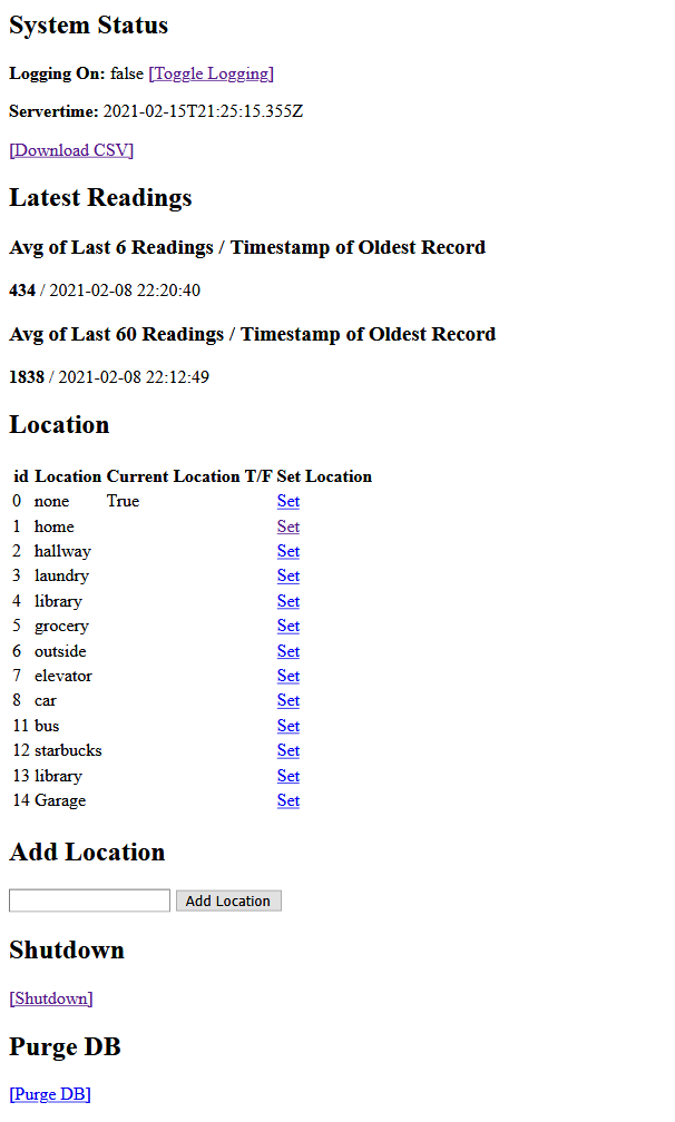 With the ESP8266, it would be quite easy to send this to a web service hosted on the cloud, however, I chose local logging, as I wanted to capture readings in places without internet connectivity, like elevators and parking garages.