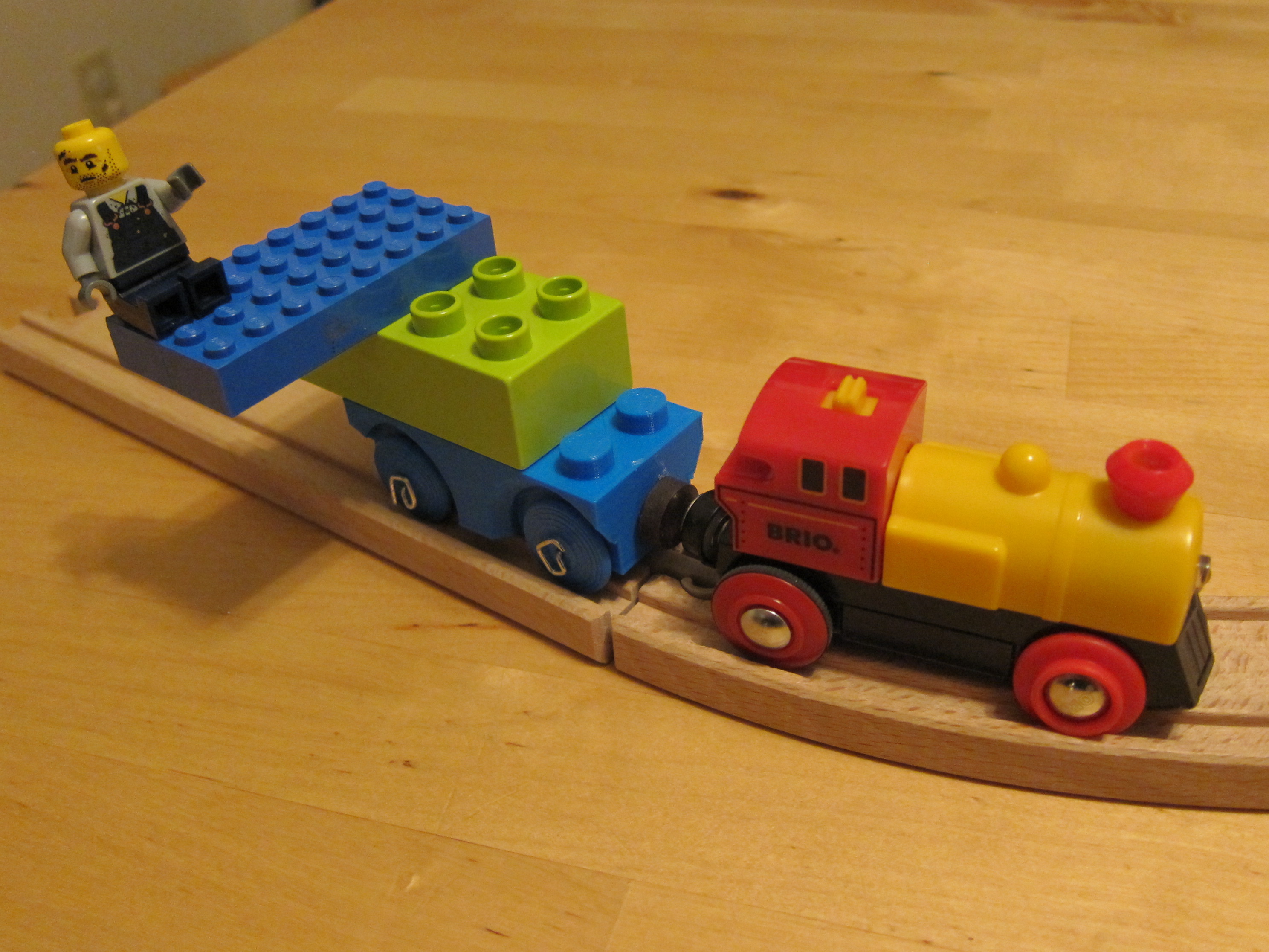 The idea of combining Duplo and Brio seemed like a great idea - I was thinking of an elaborate track with bridges over bridges, and Duplo seemed almost perfect for the job. What I really wanted was a piece with a wooden train (Brio) top, and Duplo bottom.