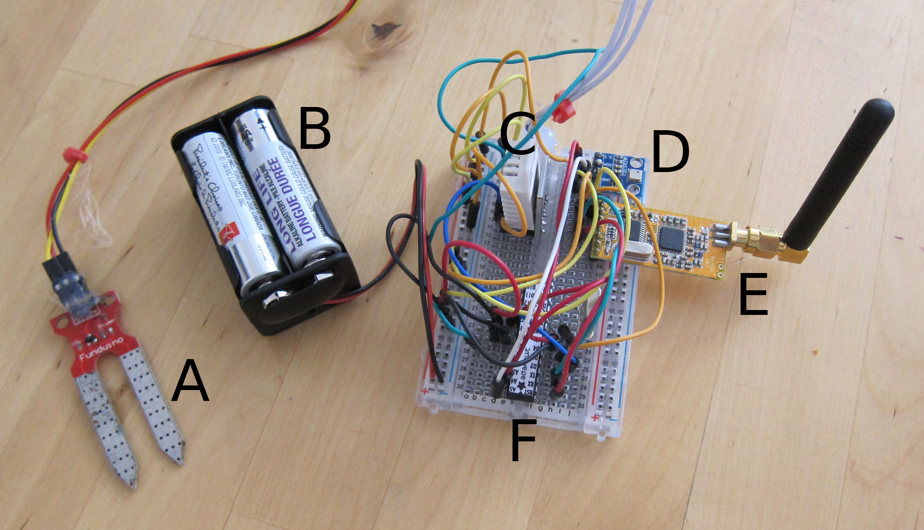 Parts List A) Soil Moisture Sensor B) Battery Pack (I use 3xAA batteries) C) DHT22 Temperature and Humidity Sensor D) BMP180 Barometric Pressure Sensor E) APC220 Wireless Module F) Bare Bones Arduino (Atmel 328P Microcontroller)