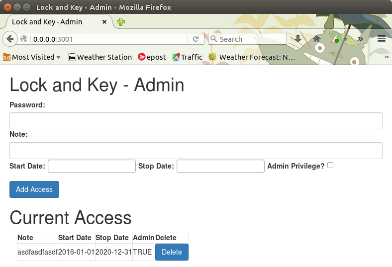 I wrote the application itself in NodeJS. Using the administrative page (behind a firewall) the Host sets up a password, has the option of adding a note, and must set dates for when the password starts and stops working. Note that there’s no login - it’s hard enough to remember a password, let alone the corresponding login. The passwords are stored hashed (using bcrypt) - it’s assumed that there are very few logins setup, so when the guest logs in, the password they enter is compared against the hash of every password in the system.