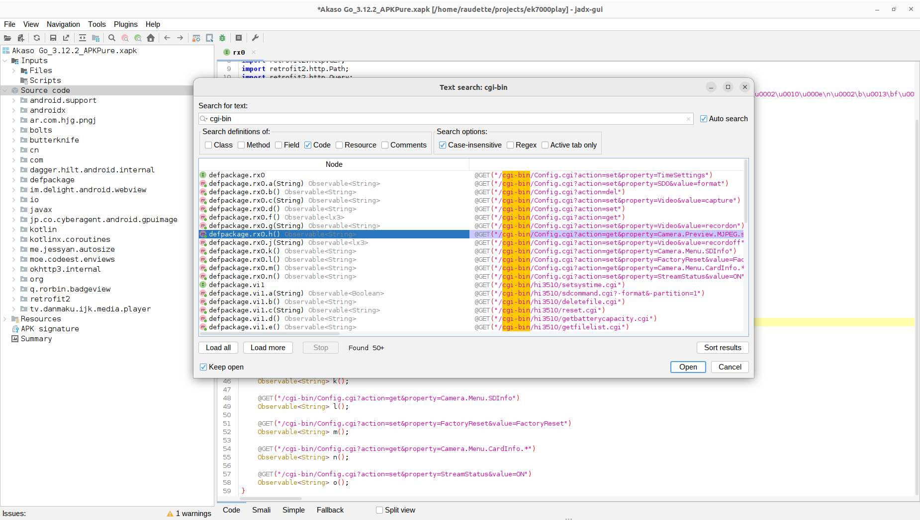 I decided to start looking at the Akaso Go app - I had never done this before, but I got the .APK/Android app from a site called apkpure.com. After reading a few tutorials, I decided to try and open it with the jadx decompiler. I was surprised with how much useful information was in the decompiled source.