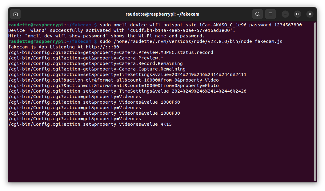 So I decided to try something else. I setup a Raspberry Pi as a wi-fi hot spot, with a configuration that matched the Akaso EK7000. On Raspbian Bookworm: