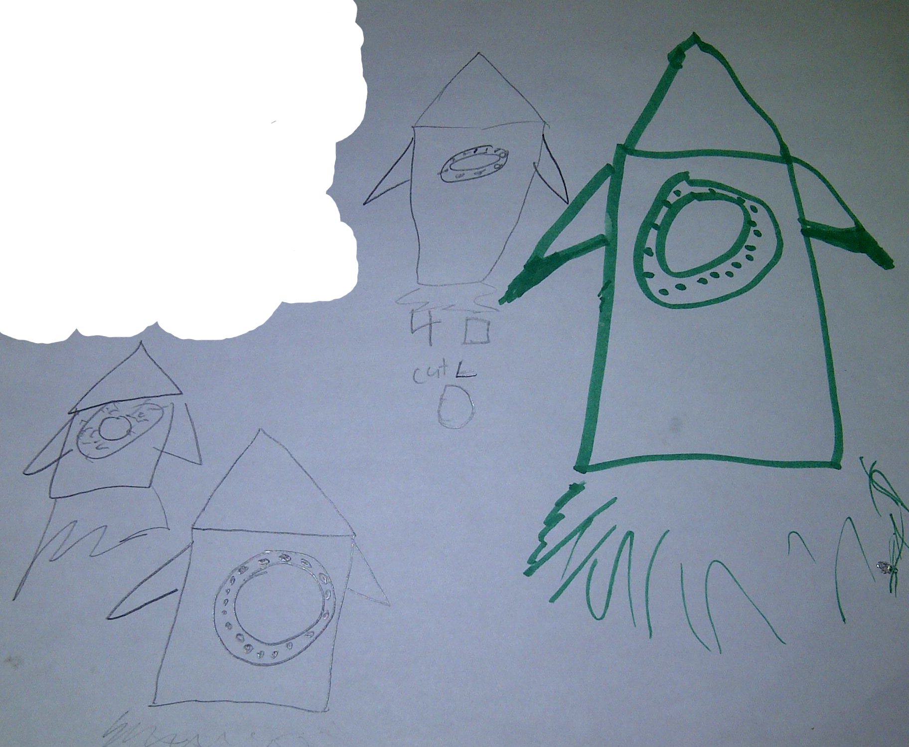 Shortly after breakfast on July 1st, Tegan picked up a recently discarded brown cardboard box sitting beside our recycle bin. She had a vision in mind: she wanted to build a rocket ship. She needed some assistance - the cardboard box was too thick to cut with her scissors. So she created a design.