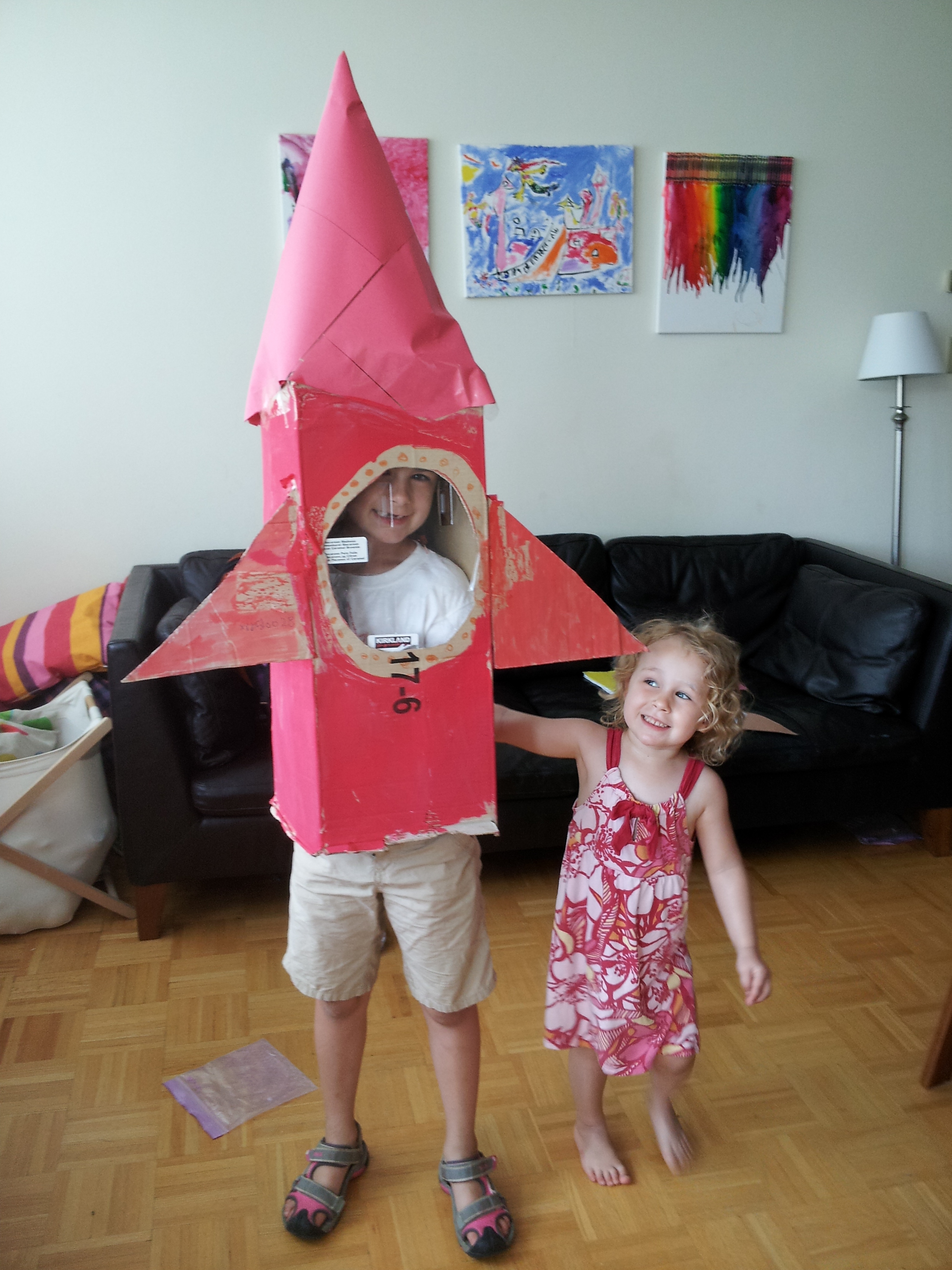 Together, the girls painted the rocket red. To this day, it sits in a corner of their room.